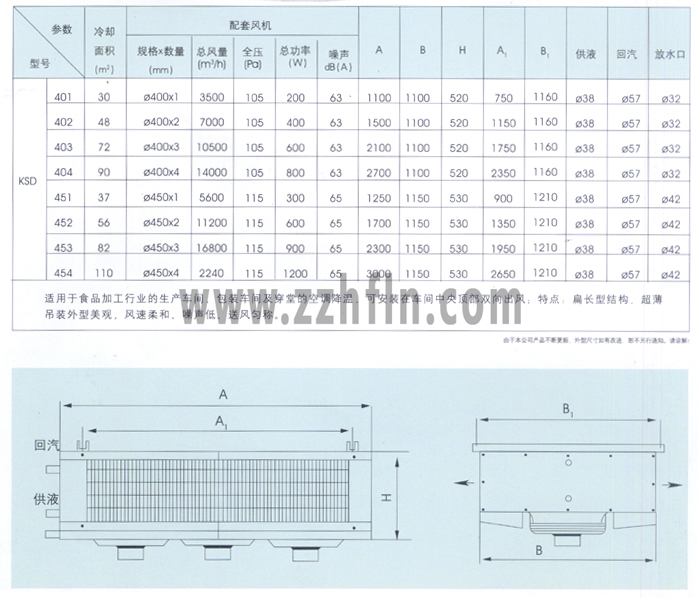 DL系列凍結(jié)、冷藏用吊頂冷風(fēng)機(jī)尺寸表參數(shù)表