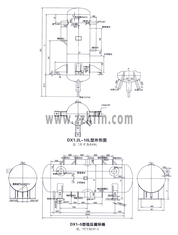 DX-L系列低壓循環(huán)桶 DX-L系列低壓循環(huán)桶為立式結(jié)構(gòu),蒸發(fā)器來的氨氣從設(shè)備上部的進氣管進入,分離液體后同節(jié)流后的閃發(fā)氣體上部的出氣管被壓縮機吸走,分離下來的氨液和高壓節(jié)流后的低壓氨液從下部出液管供給氨泵。