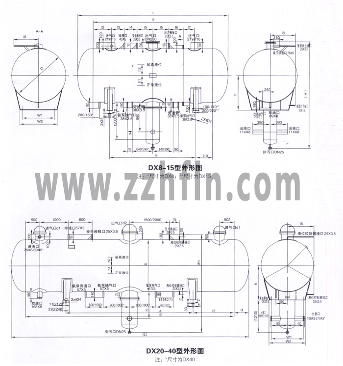 DX系列低壓循環(huán)桶為臥式結(jié)構(gòu),蒸發(fā)器來(lái)的氨氣從設(shè)備兩端的進(jìn)氣管進(jìn)入,分離液體后同節(jié)流后的閃發(fā)氣體從中部的出氣管被壓縮機(jī)吸走,分離下來(lái)的氨液和高壓節(jié)流后的低壓氨液從下部出液管供給氨泵。